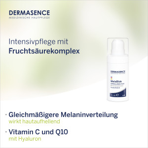 Entdecken Sie das leistungsstarke DERMASENCE MelaBlok, eine intensive Pflege, die speziell zur Aufhellung von Pigmentflecken entwickelt wurde. Mit seinem Fruchtsäurekomplex hemmt es die Melaninbildung und fördert eine gleichmäßigere Melaninverteilung für einen gleichmäßigen Teint. Dank seiner einzigartigen Formel, die mit Vitamin C und Q-10 angereichert ist, schützt das Produkt Ihre Haut vor oxidativen Zellschäden. Der MelaBlok ist dermatologisch getestet und hautfreundlich parfümiert. Es kann zu einem produktbedingten Kribbeln kommen, dies ist unbedenklich.