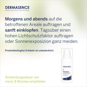 Anwendung: Anwendungsdauer von mind. 8 Wochen wird empfohlen. Morgens und abends auf die betroffenen Areale auftragen und sanft einklopfen. Tagsüber einen hohen Lichtschutzfaktor, z.B. DERMASENCE Solvinea Med LSF 50+ auftragen oder Sonnenexposition ganz meiden!