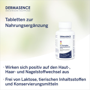 DERMASENCE H³ Komplex: Tabletten zur effektiven Nahrungsergänzung. Dieser Komplex wirkt sich positiv auf den Stoffwechsel von Haut, Haaren und Nägeln aus. Die ideale Kombination aus Vitaminen, Mineralstoffen und Spurenelementen unterstützt den täglichen Bedarf. Die Tabletten sind frei von Laktose und tierischen Inhaltsstoffen sowie Konservierungsmitteln.