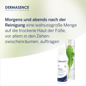 Anwendung: Morgens und abends nach der Reinigung mit DERMASENCE Wasch- und Duschlotion eine walnussgroße Menge auf die trockene Haut der Füße, vor allem in den Zehenzwischenräumen, auftragen.