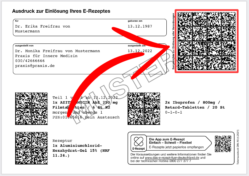 Hier haben Sie die Möglichkeit, Ihr E-Rezept einzuscannen. Bitte scannen Sie dabei ausschließlich den Code rechts oben im Eck. Die anderen aufgedruckten Codes benötigen wir nicht.